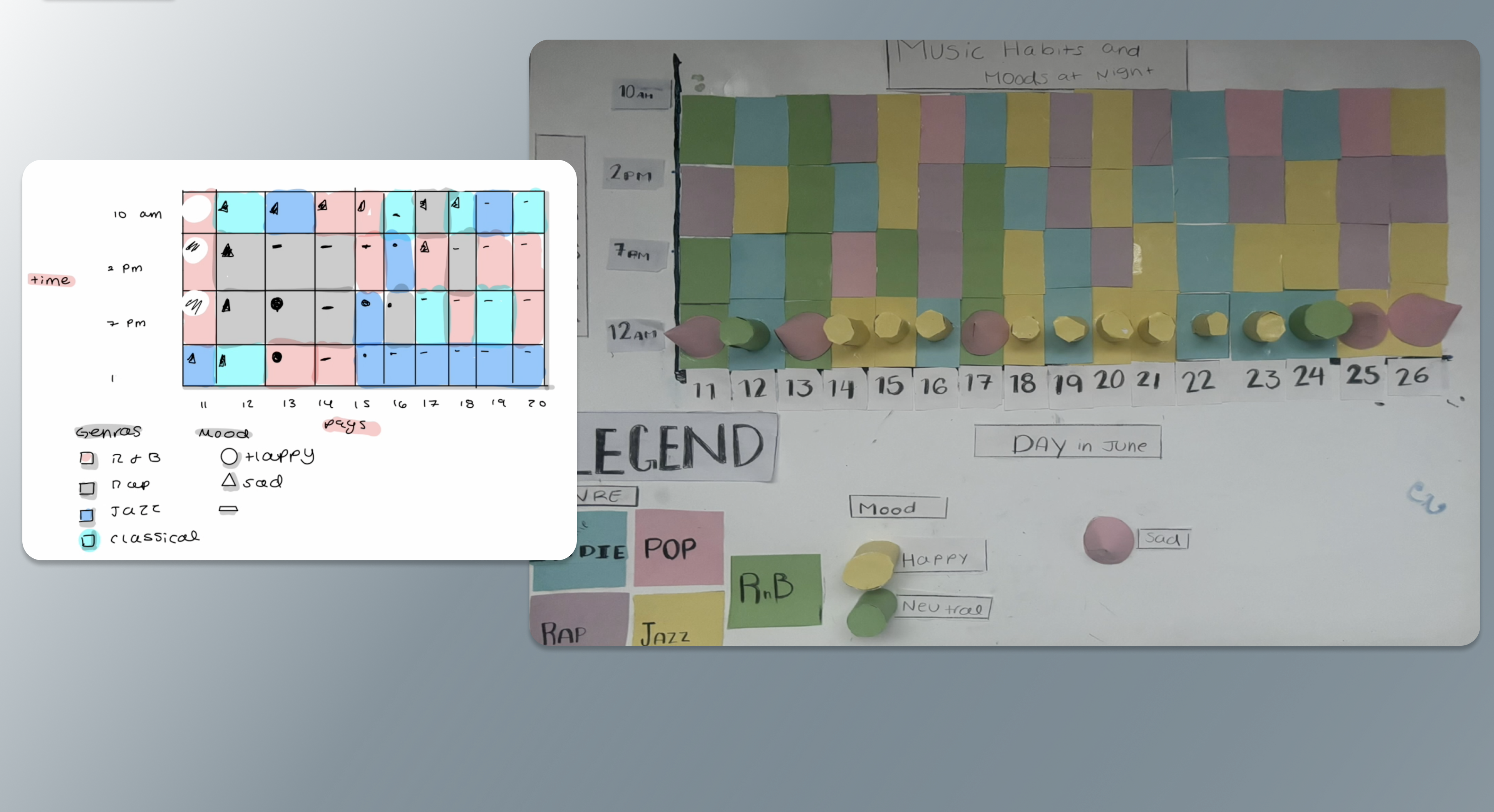 A physical data visualization representing two weeks of personal Spotify listening habits using non-traditional visualization methods.